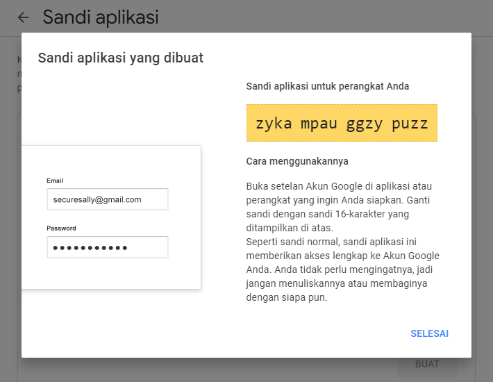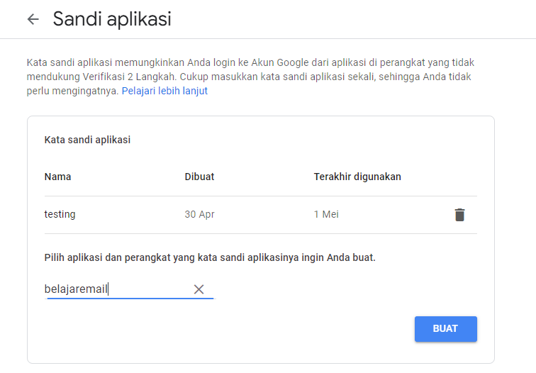 - Muncul Pilihan baru Sandi Aplikasi, Pilih aplikasi, Lainnya, Ketik contoh belajaremail, Klik Buat