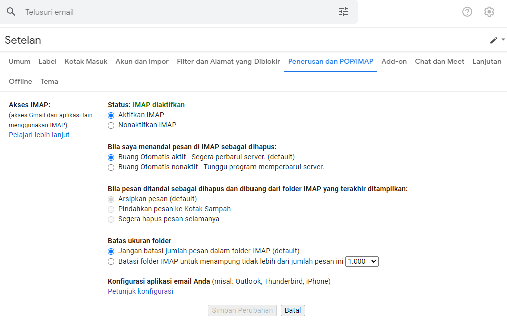 - Kalau sudah, buka Gmail, Klik Gear Pengaturan, Semua Setelan, Ke Tab POP/IMAP, Akses IMAP nya diaktifkan, lalu simpan perubahan